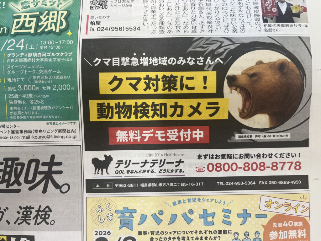 12/12発行のリビング福島、リビング郡山に掲載されました。 熊などの動物検知機能搭載のカメラを取り扱っております。 詳しくはお問い合わせください。